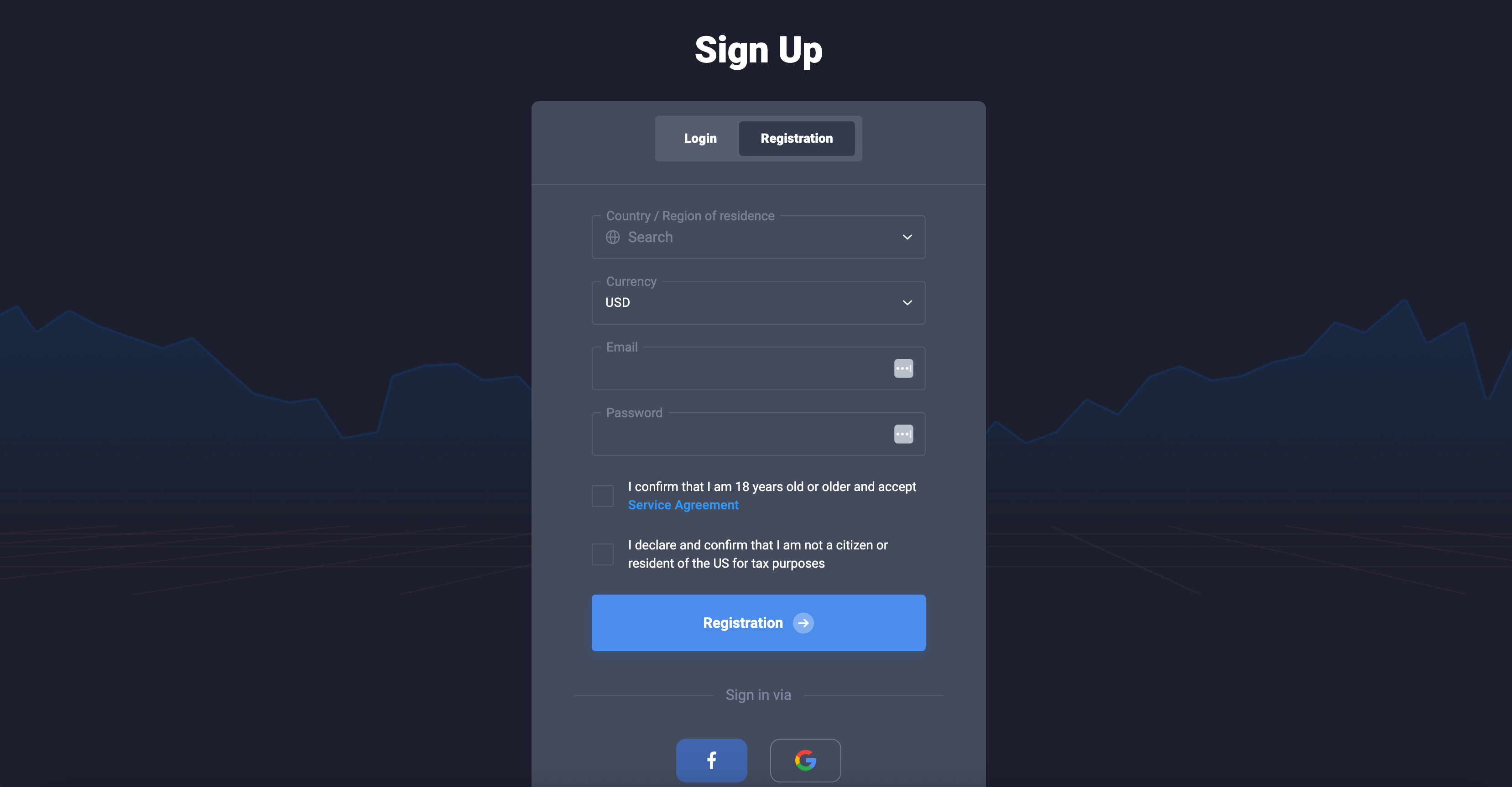 Once the page opens, click the Sign Up or Start Trading button. A registration form will appear asking for your email, password, country and preferred currency.