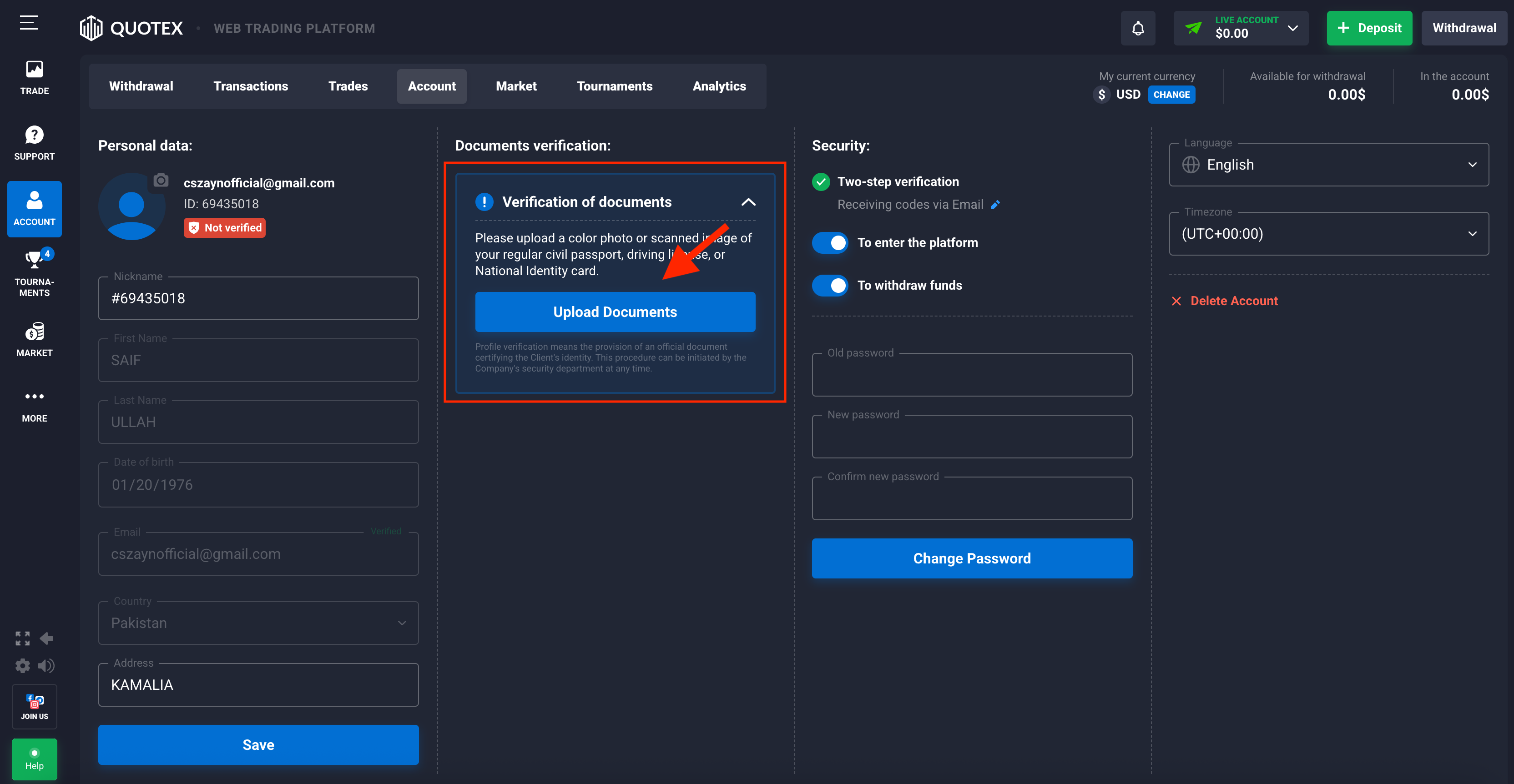 Inside Quotex account settings (Account Tab), fill these exactly as written on your ID: