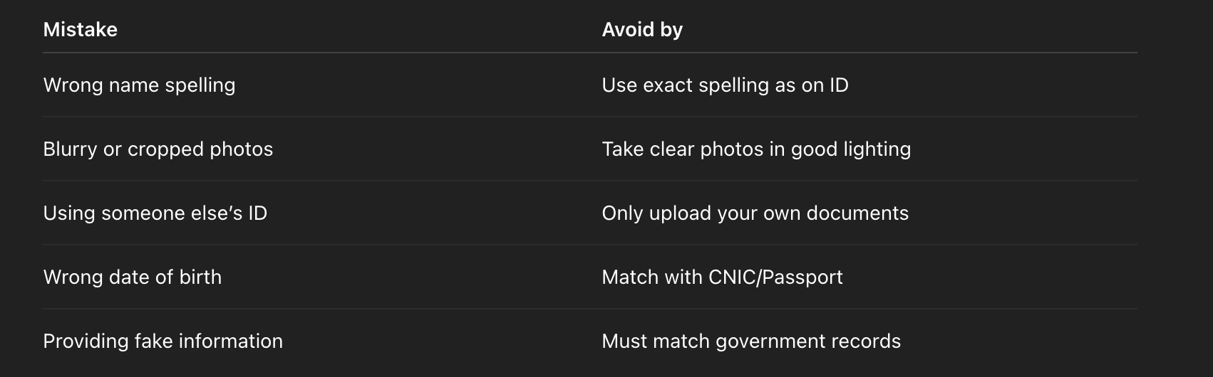 Tip: If your spelling or date of birth doesn’t match your CNIC or Passport, the verification will be rejected.